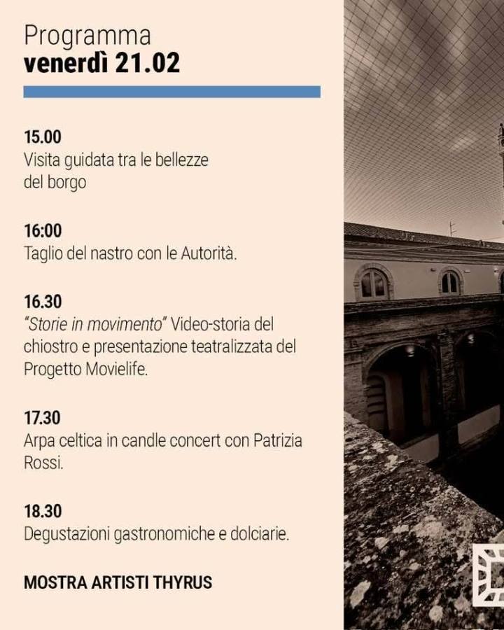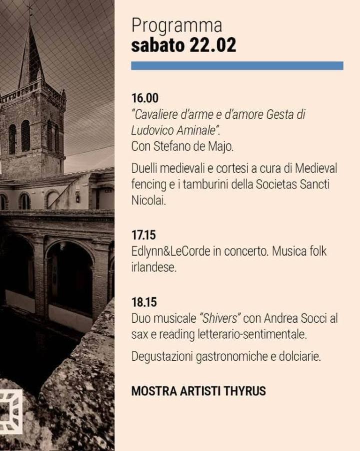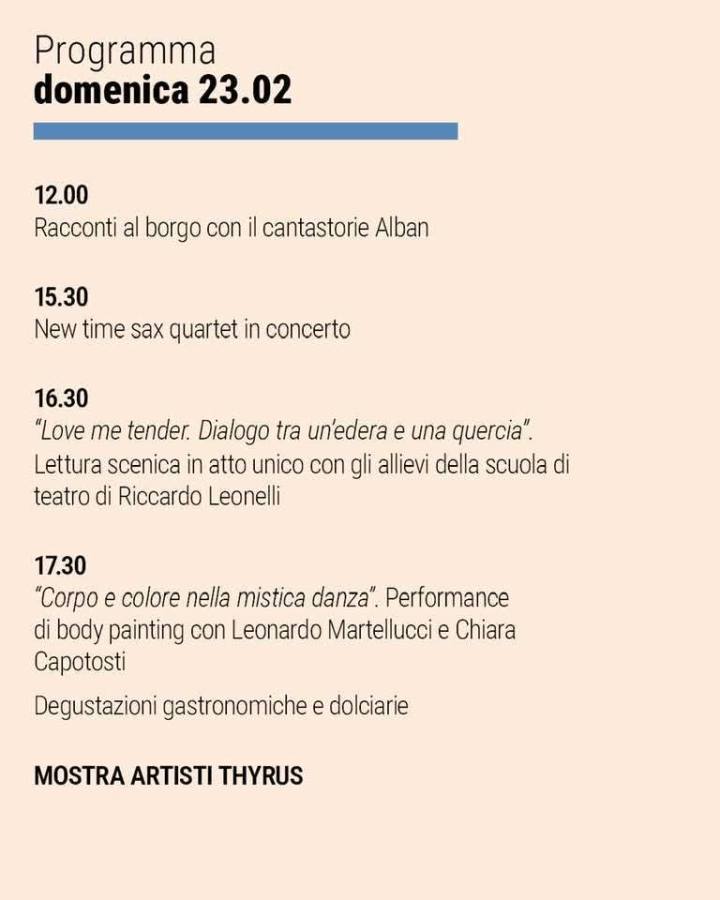 Il 21 febbraio si svolgerà una Visita guidata a Collescipoli con “Storie in movimento”, si prosegue con l’arpa celtica con Patrizia Rossi. Il 22 febbraio in scena duelli medievali, “Cavaliere d’arme e d’amore”, musica folk irlandese con Edlynn&LeCorde e reading letterario-sentimentale. Il 23 febbraio si conclude con racconti al borgo, performance teatrale “Love me tender” e performance di body painting con Leonardo Martellucci.