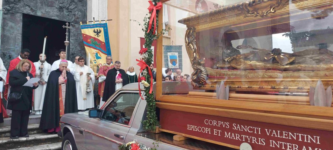 Domenica 9 febbraio, dopo il solenne Pontificale presieduto dal vescovo Soddu , la processione partirà (ore 11) dal duomo e accompagnerà le spoglia del santo in basilica, passando per via Aminale, via Barabarasa, corso del Popolo, piazza Ridolfi, piazza Europa, via Garibaldi, rotonda Filipponi, via Lungonera, via Piave, via King, via Fratelli Cervi, via Menotti Serrati, via San Valentino, via Papa Zaccaria. La festa in onore di san Valentino è la festa dell’intera città che si stringe attorno al suo patrono. Valentino fu un vescovo esemplare che spese la sua vita per aiutare gli altri: guariva i malati, soccorreva i poveri, era attento ai bambini ed ebbe un’attenzione particolare ai giovani, ed ha plasmato cristianamente con la sua testimonianza la città di Terni durante il suo lungo ministero episcopale.