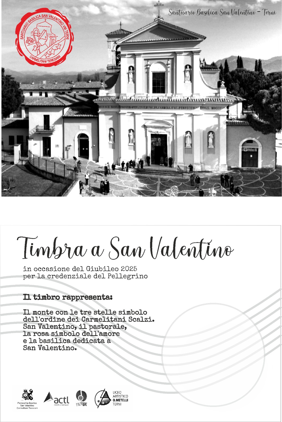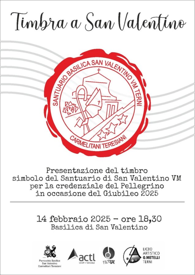 disegno realizzato dalle studentesse Sara Gubbiotti e Teresa Maria Perotti. Il processo creativo ha incluso una serie di incontri con gli studenti, durante i quali sono stati forniti spunti e indicazioni per rappresentare al meglio l’identità e il valore simbolico del timbro. Il disegno finale raffigura il monte con le tre stelle, emblema dell’Ordine dei Carmelitani Scalzi, insieme a San Valentino, il pastorale, la rosa simbolo dell’amore e la Basilica dedicata al santo. La presentazione ufficiale del nuovo timbro si terrà proprio il giorno di San Valentino alle 18,30, al termine della Santa Messa, presso la Basilica di San Valentino. Sarà un momento significativo per la comunità tutta, che vedranno il proprio patrimonio spirituale e culturale valorizzato attraverso questo simbolo distintivo.