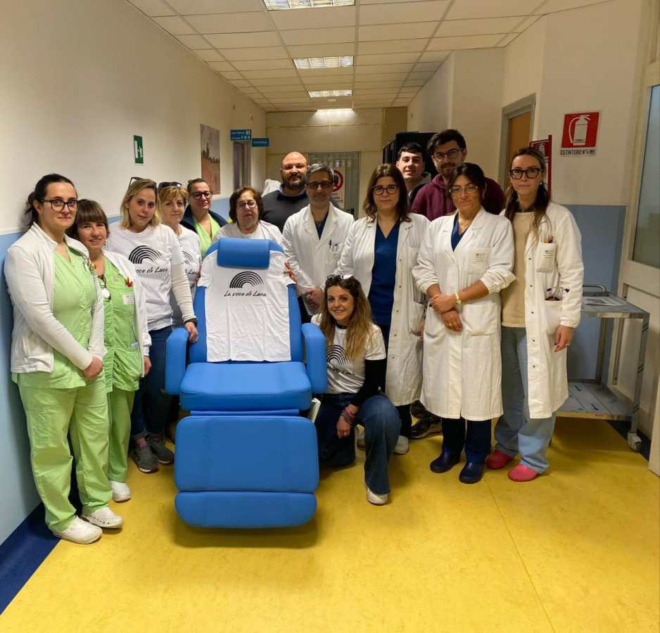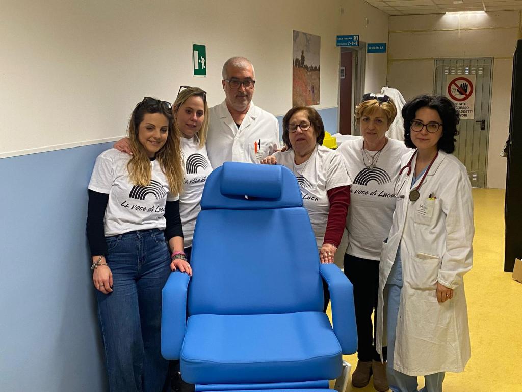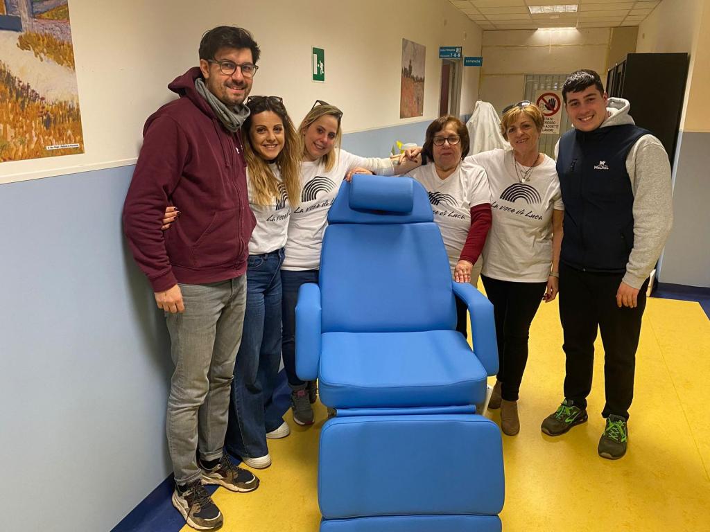 TERNI – L’associazione fondata in memoria di “Luca Quintili” ha consegnato al reparto di Oncoematologia dell’ospedale di Terni una poltrona per i pazienti. Alla consegna, con estrema emozione hanno partecipato Maria e Gloria, madre e sorella di Luca, e poi Martina, cantante del gruppo fondato insieme a Luca e la sua mamma Orietta.