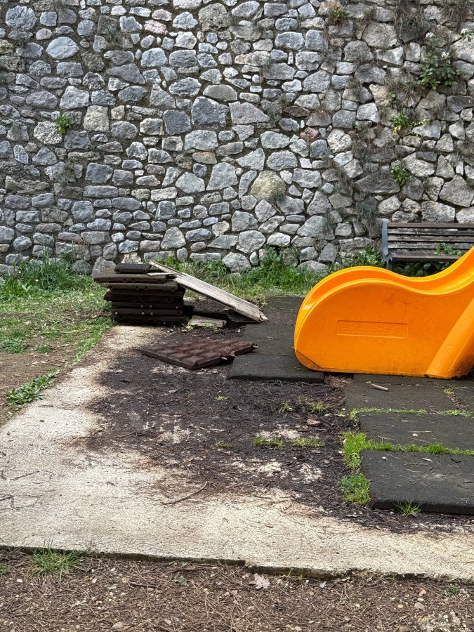 Giochi rotti o assenti. Tappeto per l’impatto rovinato e con punte in evidenza. Tavole di legno e sporcizia ammassata. Panchine con piante. Questo è lo scenario, trascurato e pericoloso. Ora che arriva la bella stagione il parco giochi rappresenta sicuramente una importante barriera per contrastare la dipendenza da schermo che oggi tutti i bambini e le bambine stanno sviluppando. Certo, un genitore fa sicuramente fatica a far giocare un bambino in un ambiente come questo.