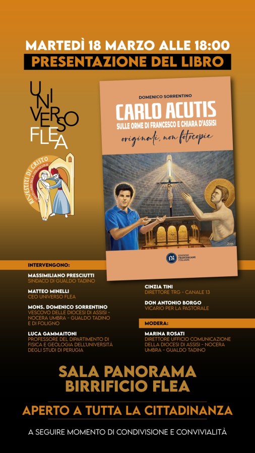 GUALDO TADINO (Perugia) – Birra Flea ed Ecosuntek, in collaborazione con le diocesi di Foligno e di Assisi-Gualdo Tadino-Nocera Umbra, hanno organizzato un evento di grande rilevanza culturale e spirituale. Martedì 18 marzo alle 18, infatti, monsignor Domenico Sorrentino, vescovo delle due diocesi, sarà ospite e relatore per la presentazione del suo libro ‘Carlo Acutis. Sulle orme di Francesco e Chiara d’Assisi – Originali, non fotocopie’.