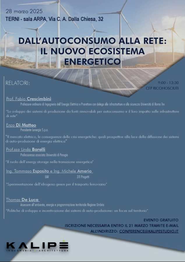 TERNI – La città di Terni si prepara ad accogliere un importante evento dedicato al futuro dell’energia e all’autoconsumo, dal titolo “Dall’autoconsumo alla rete: il nuovo ecosistema energetico”, che si terrà presso la sala ARPA di Via C. A. Dalla Chiesa, 32. L’iniziativa, organizzata da Kalipe Studio Srl in collaborazione con l’Ordine degli Ingegneri della Provincia di Terni, rappresenta un’occasione di alto profilo scientifico e istituzionale per approfondire le sfide e le opportunità legate alla transizione energetica, con particolare attenzione all’autoproduzione e all’integrazione delle fonti rinnovabili nei sistemi di rete.