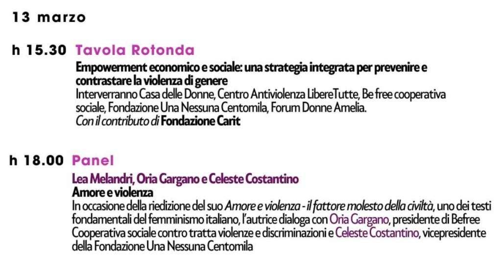 Il pomeriggio alla Casa delle Donne proseguirà alle 18 con un confronto, inserito nel programma del Festival (R)esistenze Femministe, tra Oria Gargano, presidente di Befree coop. Sociale contro tratta Violenza e discriminazioni, e la filosofa femminista Lea Melandri, a partire dal suo saggio, recentemente ristampato, “amore e Violenza”.