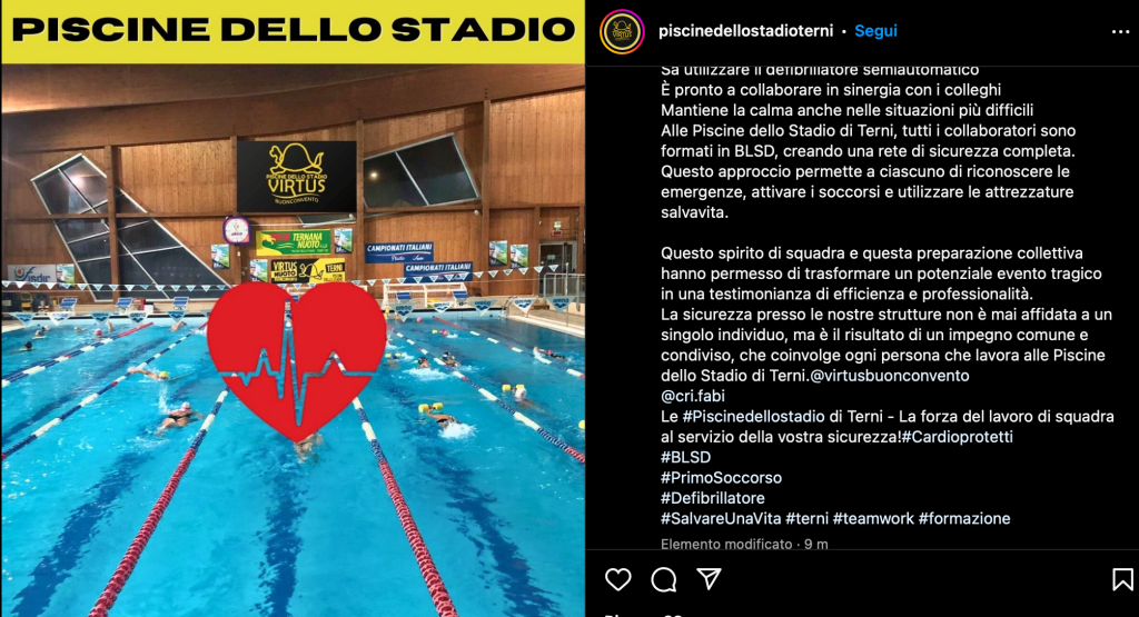 Il post procede affermando che: «L’utilizzo del defibrillatore e le procedure BLSD sono state decisive. Una struttura cardioprotetica a 360°. L’episodio recente ha dimostrato non solo l’efficacia delle nostre attrezzature, ma soprattutto l’importanza di avere un team completo, dove ogni membro: Conosce le procedure di emergenza Sa utilizzare il defibrillatore semiautomatico È pronto a collaborare in sinergia con i colleghi Mantiene la calma anche nelle situazioni più difficili Alle Piscine dello Stadio di Terni, tutti i collaboratori sono formati in BLSD, creando una rete di sicurezza completa. Questo approccio permette a ciascuno di riconoscere le emergenze, attivare i soccorsi e utilizzare le attrezzature salvavita. Questo spirito di squadra e questa preparazione collettiva hanno permesso di trasformare un potenziale evento tragico in una testimonianza di efficienza e professionalità. La sicurezza presso le nostre strutture non è mai affidata a un singolo individuo, ma è il risultato di un impegno comune e condiviso, che coinvolge ogni persona che lavora alle Piscine dello Stadio di Terni».