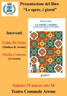 TERNI – La dedizione crea opere meravigliose, anche in un momento in cui tutto evolve al digitale e alla tecnologia, c’è ancora chi si dedica al lavoro manuale, con passione. Sono alcuni degli aspetti messi in evidenza nel libro intitolato “Le opere, i giorni. Storie quotidiane di passione (Gambini Editore)” una raccolta di racconti di Antonio Fresa. Il volume sarà presentato il 15 marzo o alle ore 18,00 presso il Teatro Comunale di Arrone alla presenza di i Fabio Di Gioia, sindaco di Arrone e e Mattia Contessa, avvocato.