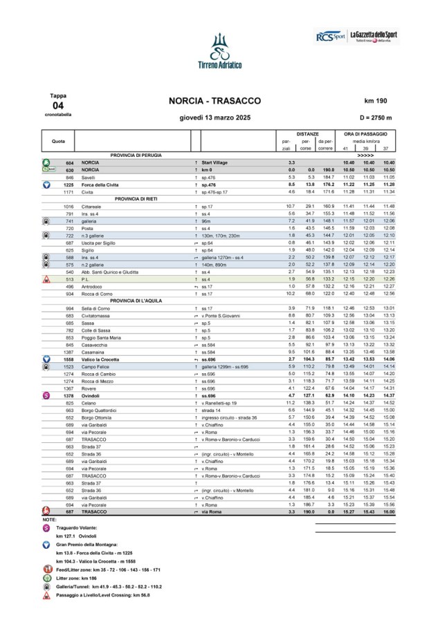 Si parte mercoledì 12 marzo, con la Follonica-Colfiorito (lunga 239 chilometri), valevole come terza frazione. La prima località umbra ad essere toccata dal gruppo proveniente dalla Toscana sarà Po’ Bandino, per poi continuare con Moiano, Piegaro, Castel del Piano (località in cui è posto il traguardo volante) e San Martino in Colle. Sarà quindi la volta di Torgiano, Passaggio di Bettona, Cannara e Spello. Quindi, i ciclisti transiteranno per Foligno, Colle di San Lorenzo e Casenove con finalissimo mozzafiato con tanto di Gran premio della montagna al valico di Colfiorito. Il giorno successivo (giovedì 13 marzo) la partenza della quarta tappa è fissata Norcia. Dopo il via dalla città di San Benedetto, i corridori transiteranno per Savelli per poi inerpicarsi fino al Gmp di Forca della Civita prima di scendere alla laziale Cittaducale. Trionfo di valichi appenninici in Abruzzo e traguardo posto, dopo 194 chilometri di pedalate, a Trasacco. Ma le emozioni sulle due ruote quest’anno non finiscono qui. Appuntamento imperdibile per gli appassionati di pedali domenica 18 maggio, con la partenza della nona tappa del Giro d’Italia da Gubbio.