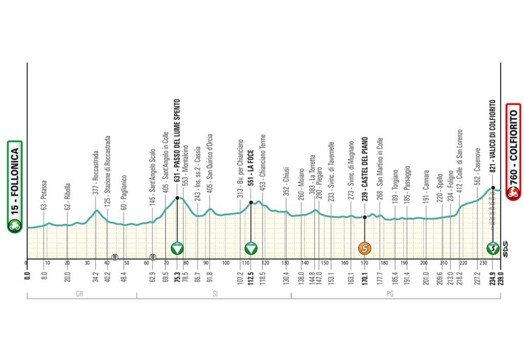Lido di Camaiore-Lido di Camaiore (crono individuale, 11,5 km), Camaiore-Follonica (192 km), Follonica-Colfiorito (239 km), Norcia-Trasacco (190 km), Ascoli Piceno-Pergola (205 km), Cartoceto-Frontignano (163 km), Porto Potenza Picena-San Benedetto del Tronto (147 km)