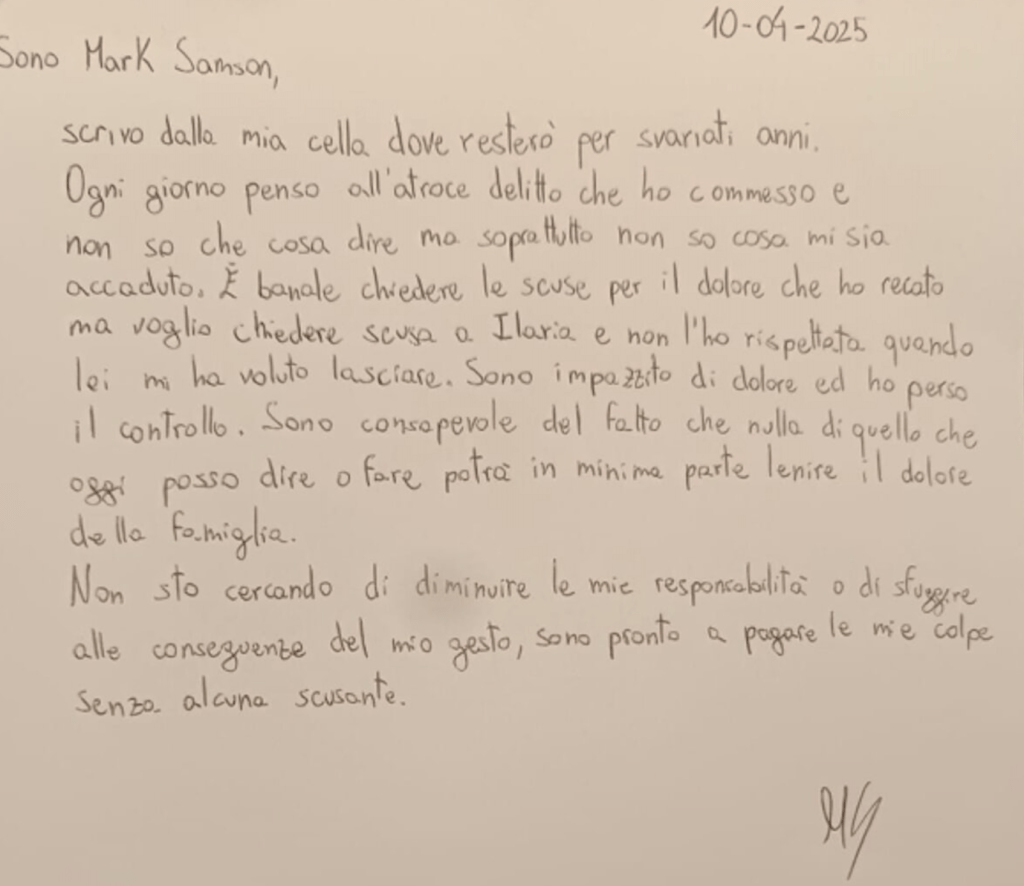 Troppo dolore tutto insieme. E troppi misteri, tutti al vaglio degli inquirenti. Intanto, dopo l’autopsia suo corpo di Ilaria, si sta cercando di stabilire l’orario esatto della sua morte. Mark ha raccontato che poco prima di ucciderla le aveva portato la colazione al letto, un panino con la mortadella e il caffè. Tracce di questi elementi nello stomaco della vittima potrebbero confermare la versione dell’assassino oppure spostare le lancette dell’omicidio alla sera prima, a quando in casa c’era anche il padre di Mark. In tutto questo crescendo di informazioni e dolore, la lettera di Mark ai genitori di Ilaria suona come l’ennesima cattiveria.