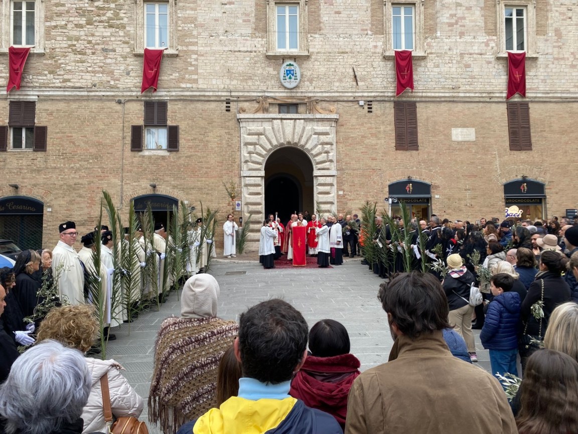 PERUGIA – «La Domenica delle Palme è sentita un po’ da tutti. C’è una grande attenzione attorno al dono dell’ulivo, un po’ perché richiama tutti a un dono di pace e di speranza». Così l’arcivescovo Ivan Maffeis alla celebrazione della Domenica delle Palme, il 13 aprile, a Perugia, dopo aver benedetto i ramoscelli d’ulivo davanti all’arcivescovado e, in processione con fedeli e rappresentanti degli ordini di Malta e del Santo Sepolcro, fatto ingresso dalla porta giubilare nella cattedrale di San Lorenzo facendo memoria dell’arrivo di Gesù a Gerusalemme.