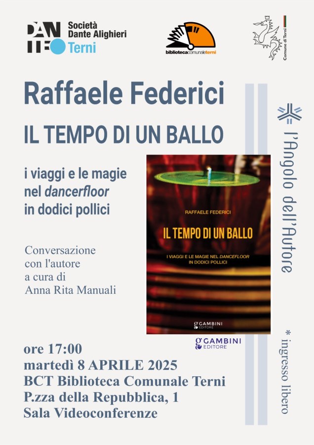 TERNI – Lo scrittore, pittore, docente di Sociologia e Presidente dell’Unitre di Terni, Raffaele Federici presenterà il suo nuovo libro intitolato “Il tempo di un ballo – i viaggi e le magie nel dancerfloor in dodici pollici” alla biblioteca comunale di Terni. L’appuntamento è fissato per l’8 aprile, alle ore 17, presso la Sala Videoconferenze della Bct. L’autore dialogherà con la presidente della Società Dante Alighieri di Terni, Anna Rita Manuali, nell’ambito della rassegna “Angolo dell’autore”.