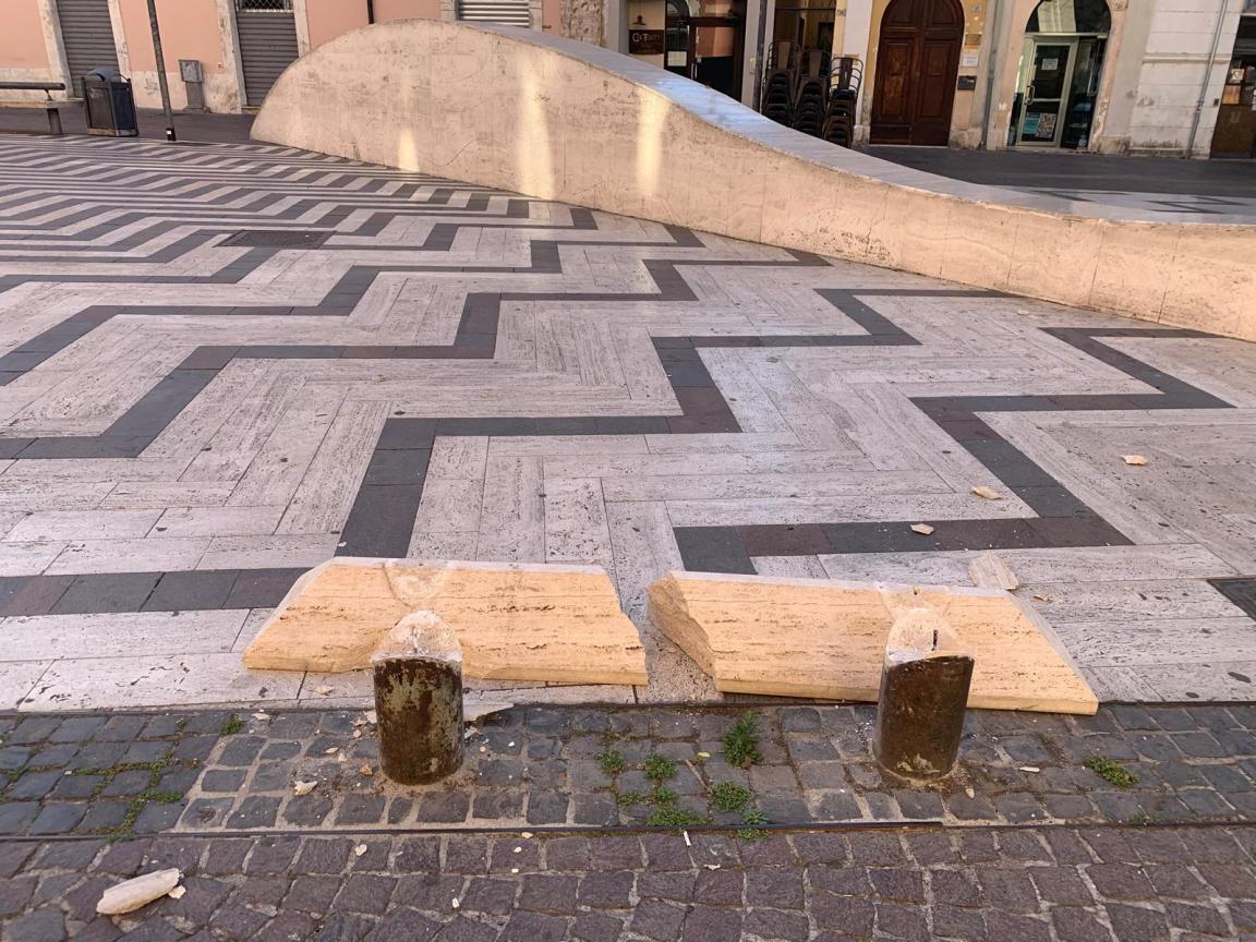 E’ letteralmente in frantumi una delle sedute in travertino. Sabato (31 maggio) mattina ancora così, senza transenne di pericolo, in totale abbandono.