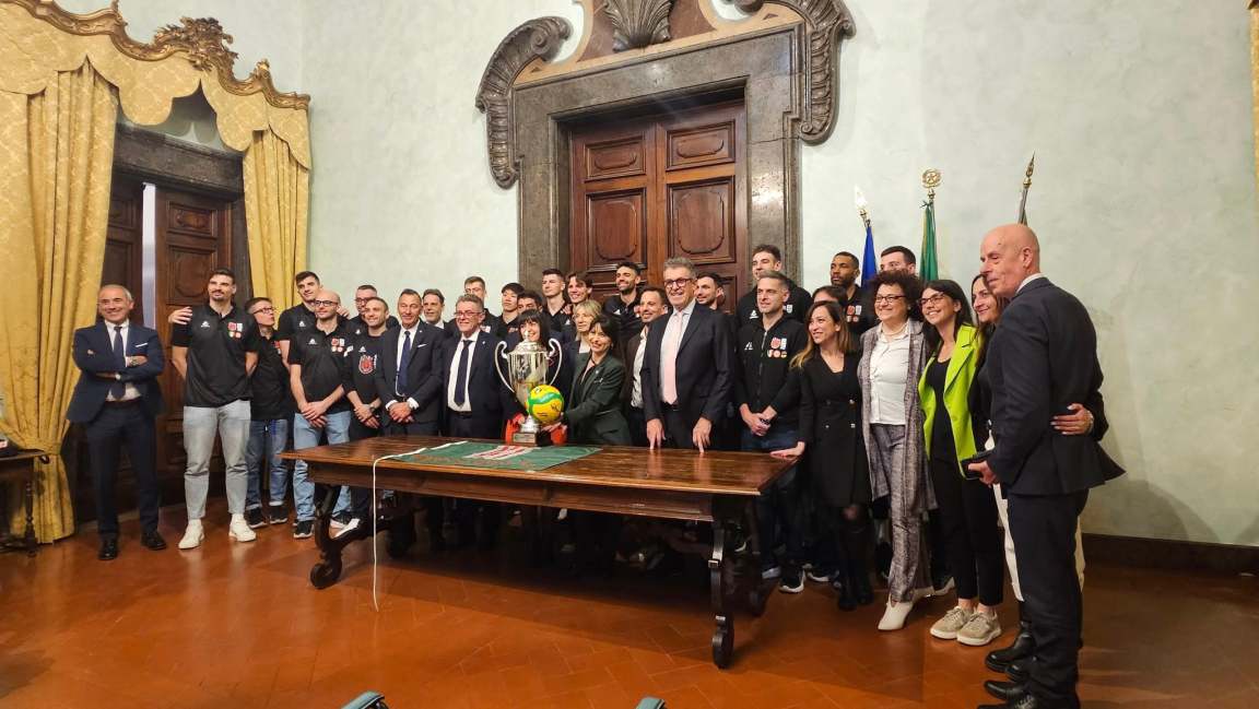 PERUGIA – Sir Sicoma Monini Perugia sotto i riflettori del capoluogo umbro nella mattina di mercoledì 21 maggio. I campioni d’Europa, coach Angelo Lorenzetti, il presidente Gino Sirci e tutto lo staff bianconero sono infatti stati ricevuti dall’amministrazione comunale a palazzo dei Priori dall’assessore allo Sport Pierluigi Vossi, poi dalla sindaca Vittoria Ferdinandi che è arrivata all’ultimo per via di impegni istituzionali improvvisi, e, a seguire, a palazzo Donini dalla presidente della Regione Umbria Stefania Proietti, accompagnata dall’assessore regionale allo Sport Simona Meloni e dalla presidente dell’Assemblea legislativa Sarah Bistocchi.