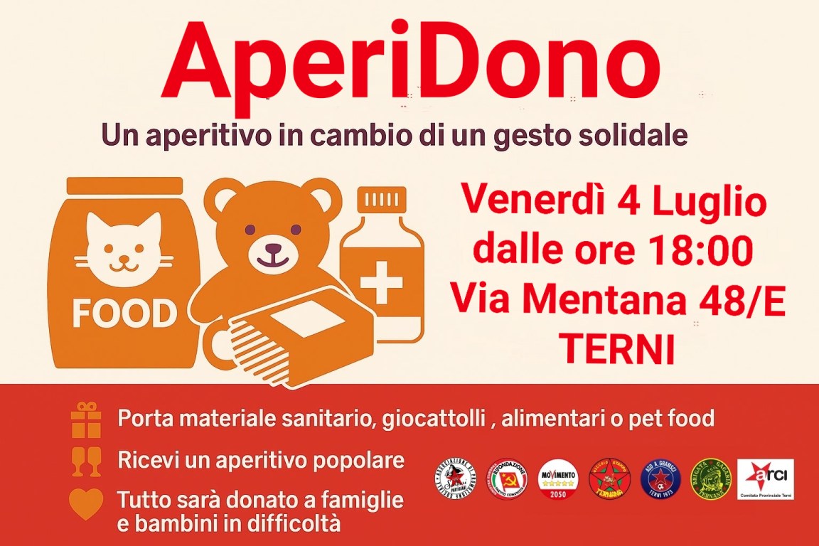 TERNI – Il 4 luglio 2024, a partire dalle ore 18.00, Terni ospiterà “Aperidono”, un evento solidale che unisce la convivialità dell’aperitivo a un gesto concreto di aiuto per chi è in difficoltà. L’appuntamento si terrà presso la sede del Partito della Rifondazione Comunista, in Via Mentana 48/E, e sarà aperto a tutta la cittadinanza.