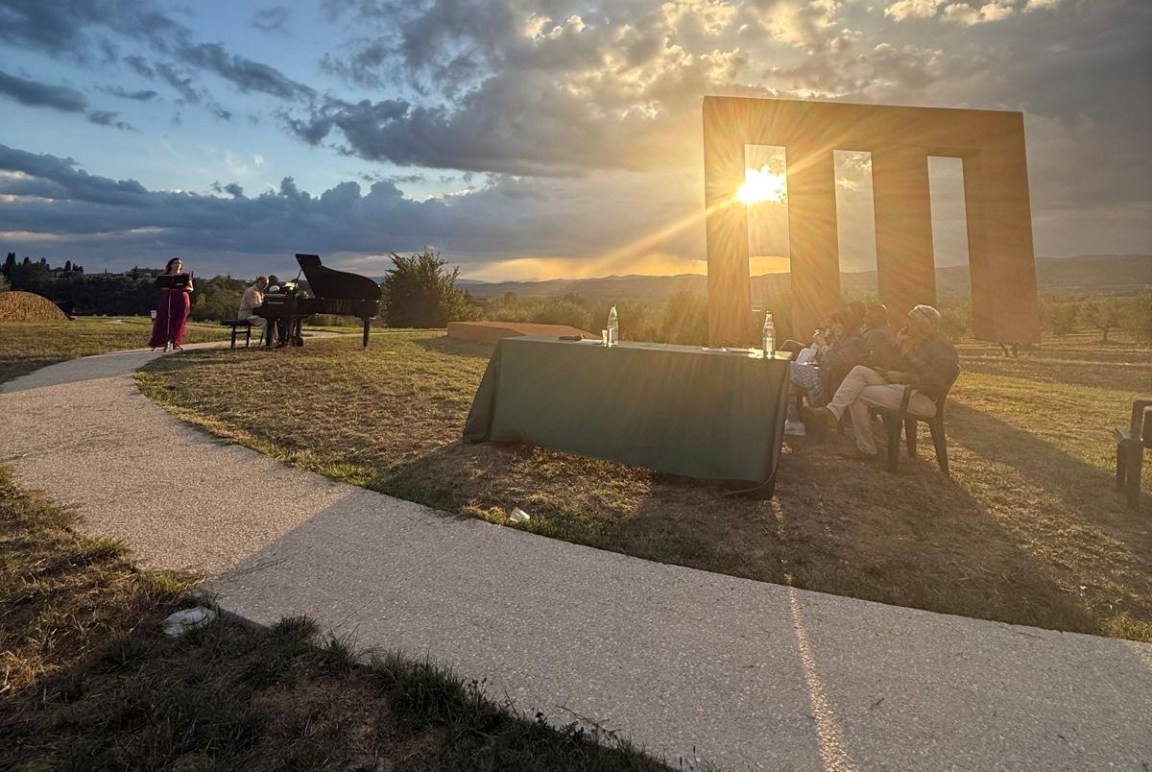 Un evento presso il Parco delle Sculture di Brufa, con persone sedute a un tavolo mentre una donna legge un documento; sullo sfondo è visibile una scultura e un paesaggio con il sole che splende attraverso le nuvole.