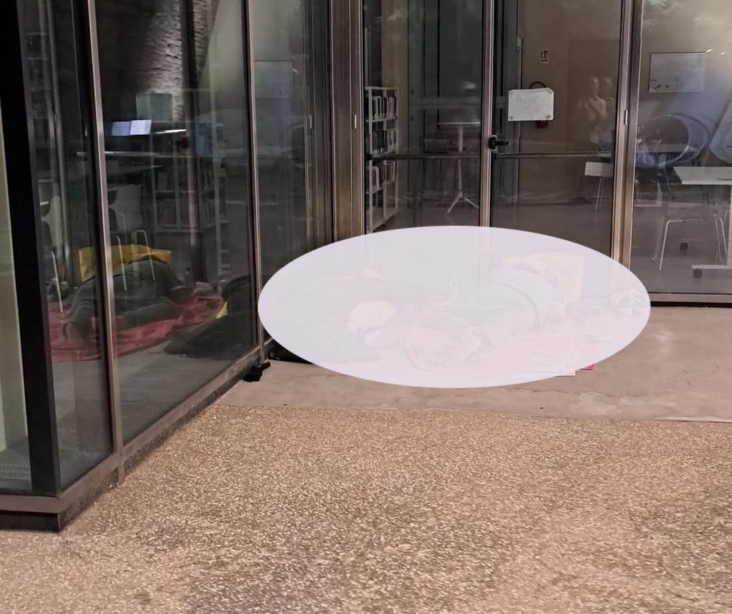 Riferendomi al caso concreto, faccio presente che la persona fotografata – peraltro non credo con il suo consenso – staziona in quella zona da almeno 6/7 anni (ma forse di più) e, fino a qualche mese fa dormiva sul gradone/mensola esterno alla finestra della stessa biblioteca, in cima alle scale mobili, prima che qualcuno, per evitare che la sua presenza disturbasse coloro che uscivano dalle scale, pensasse di metterci delle (credo) pigne di ferro, sulla cui estetica mi consentirete di non esprimermi.