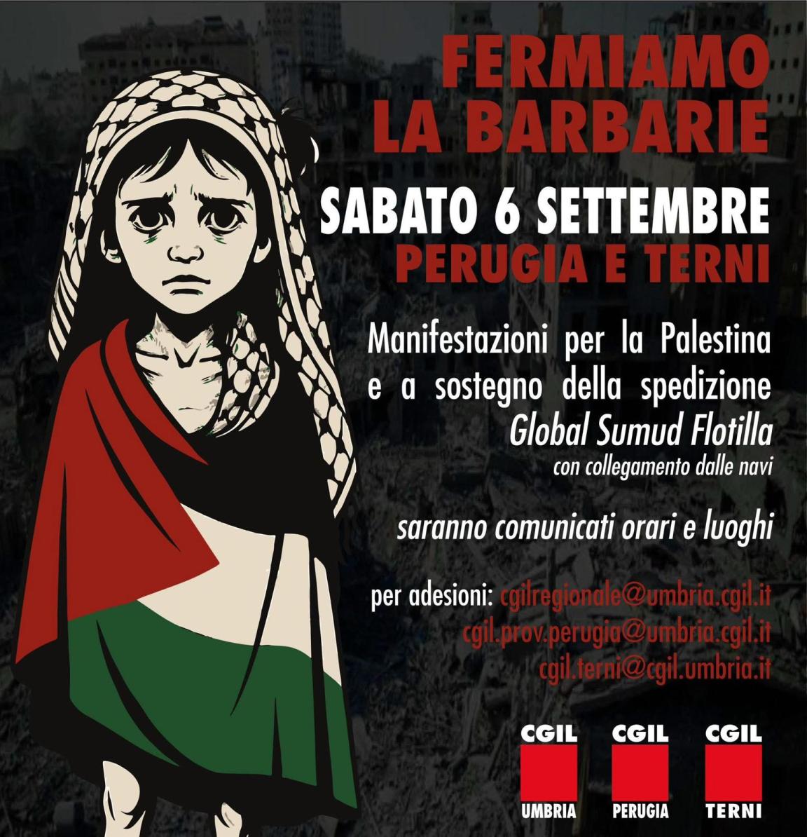 TERNI – Sabato 6 settembre anche Terni scenderà in piazza per dire basta alle violenze e per sostenere la popolazione palestinese. L’iniziativa, promossa dalla CGIL insieme a numerose realtà associative, fa parte della giornata di mobilitazione che coinvolgerà sia Terni sia Perugia, con manifestazioni dal titolo eloquente: “Fermiamo la barbarie”.