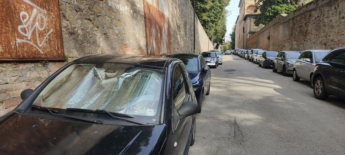 Recita un post sul gruppo Perugia Sosta Selvaggia, in cui due immagini mostrano in pieno la situazione poco decorosa lungo la via che costeggia i Giardini del Frontone: «Giornata di ordinaria follia in Borgo XX Giugno. Auto sul marciapiede e pedoni costretti a camminare dove capita».