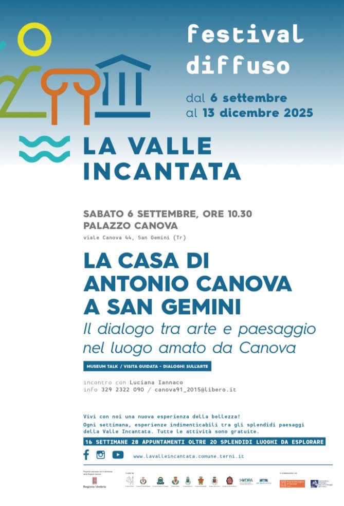 Ad aprire la rassegna sarà l’evento dal titolo La casa di Antonio Canova a San Gemini – Il dialogo tra arte e paesaggio nel luogo amato da Canova, in programma sabato 6 settembre alle ore 10.30 presso Palazzo Canova, in viale Canova 44 a San Gemini. Un’occasione unica per scoprire il legame profondo tra il grande scultore neoclassico e questi luoghi, attraverso museum talk, visita guidata e dialoghi sull’arte.