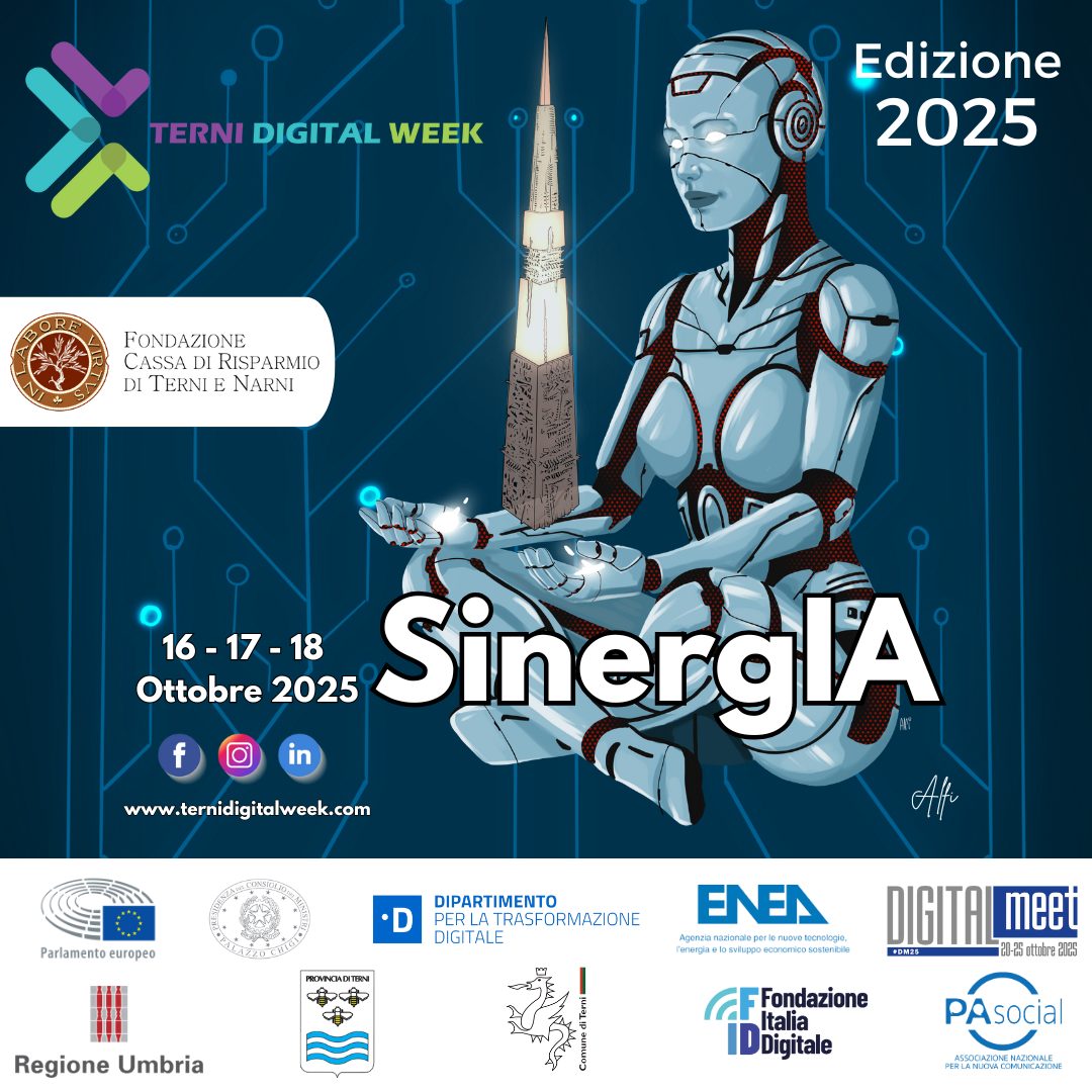 TERNI – Partirà giovedì 16 ottobre la Terni Digital Week 2025 e durerà fino a domenica 19 l’evento che giunge alle settima edizione. La manifestazione, patrocinata dal Parlamento Europeo, dalla Presidenza del Consiglio dei Ministri – Dipartimento per la trasformazione digitale, da AgID, ENEA, Regione Umbria, Provincia e Comune di Terni, si conferma tra i principali appuntamenti nazionali dedicati alla diffusione della cultura digitale. Terni Digital Week punta a ridurre il divario tecnologico e culturale, promuovendo inclusione, innovazione e conoscenza delle tecnologie del futuro. Il programma prevede incontri, workshop e meeting su temi come intelligenza artificiale, metaverso, social media, robotica, blockchain, sanità innovativa, gaming e startup. Pre opening con il corso di formazione, giovedì pomeriggio alle ore 17, in collaborazione con Ordine degli Ingegneri della Provincia di Terni , Ordine degli Architetti, Pianificatori, Paesaggisti e Conservatori della Provincia di Terni, Collegio Provinciale Geometri e Geometri Laureati di Terni.