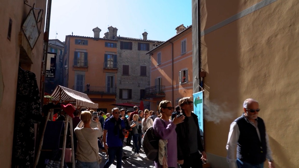 «C’è sempre grande attesa – ha dichiarato il sindaco Mirco Rinaldi – per questo evento. Questa festa a Montone non è solo la mostra mercato dei prodotti del bosco e del sottobosco, ma è anche artigianato, scoperta delle tradizioni antiche, momenti culturali e spettacoli grazie a un ricco calendario di eventi. Quella che si vive a Montone è un’esperienza immersiva, anche con attività nei boschi e nella natura che consentono di godere della bellezza del territorio e iniziative che danno la possibilità di entrare nella vita delle nostre comunità ancora ricche di storia e cultura». Per le vie del borgo, tra i vicoli e nelle cantine sono dunque in mostra prodotti del territorio e di artigianato artistico. Ad arricchire la proposta tanti eventi tra musica e street band, artisti di strada, laboratori, degustazioni, giochi di una volta e passeggiate sui pony per i più piccoli, e, novità di quest’anno, la presenza del funambolo Kennistrip che darà dimostrazione della sua arte. Domenica, quindi, tutti ‘con il fiato sospeso’ e gli occhi all’insù per la traversata dell’artista tra i due campanili, alle 12.30 e alle 16.30. Nella giornata di venerdì 31 ottobre è stata inaugurata l’iniziativa Piazza dei maestri scalpellini a cui ha partecipato anche l’Università dei muratori di Gubbio che ha proposto alcune dimostrazioni di questo antico mestiere.