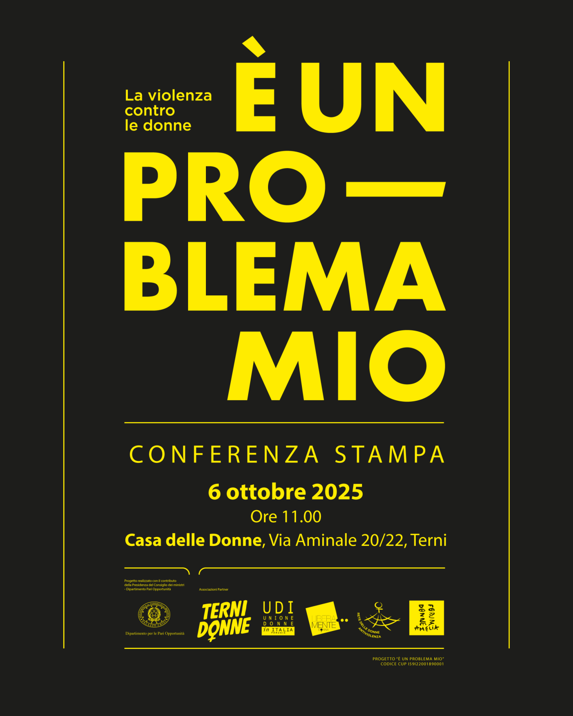 TERNI – Lunedì 6 ottobre, alle ore 11, presso la Casa delle Donne di Terni (via Aminale 20/22), si terrà la conferenza stampa di presentazione del progetto biennale “È un problema mio”, promosso da Terni Donne APS in partenariato con Libera…mente Donna ETS, Rete delle Donne Antiviolenza, Forum Donne Amelia e UDI Perugia ETS. L’iniziativa è finanziata dal Dipartimento per le Pari Opportunità e ha carattere regionale.