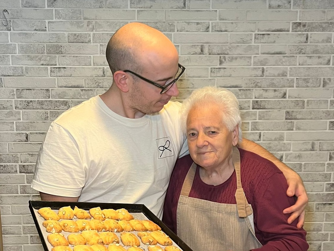 Riccardo Rinaldi e la sua nonna sorridono insieme nella cucina, mentre tengono in mano una teglia con biscotti freschi.