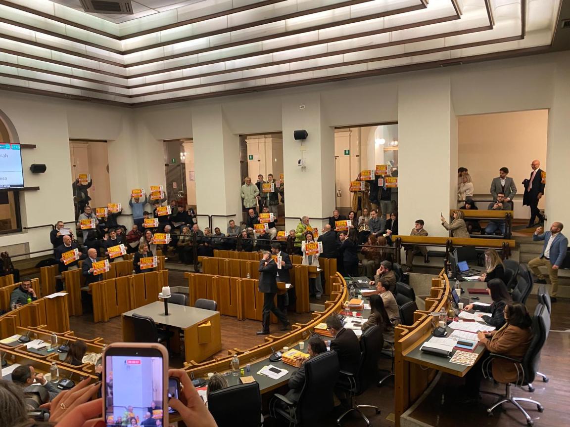 Subito dopo il “no” i consiglieri di opposizione e alcune persone tra il pubblico hanno esibito cartelli con scritto “La sinistra tassa gli umbri +184 milioni dalle tasche dei cittadini”. Intervento dei commessi per riportare ordine e presidente Bistocchi costretta a sospendere i lavori dell’assemblea.