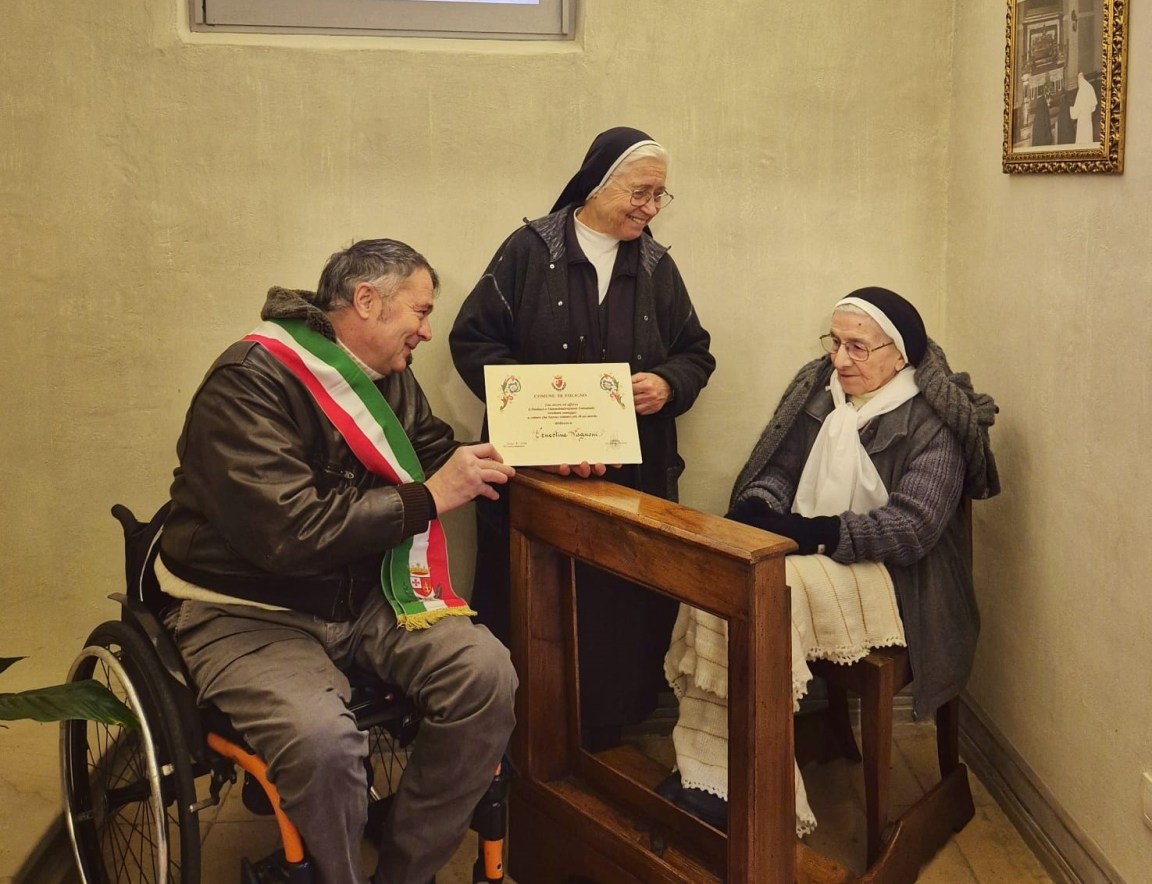 FOLIGNO (Perugia) – «Questa mattina, in occasione del suo centenario, ho consegnato personalmente a suor Ernestina Vagnoni, che vive nello storico e suggestivo monastero di Sant’Anna, circondata dall’affetto delle consorelle, la pergamena che come Amministrazione Comunale inviamo ai centenari ed ultracentenari che vivono nella nostra città». Lo ha reso noto il sindaco Stefano Zuccarini.