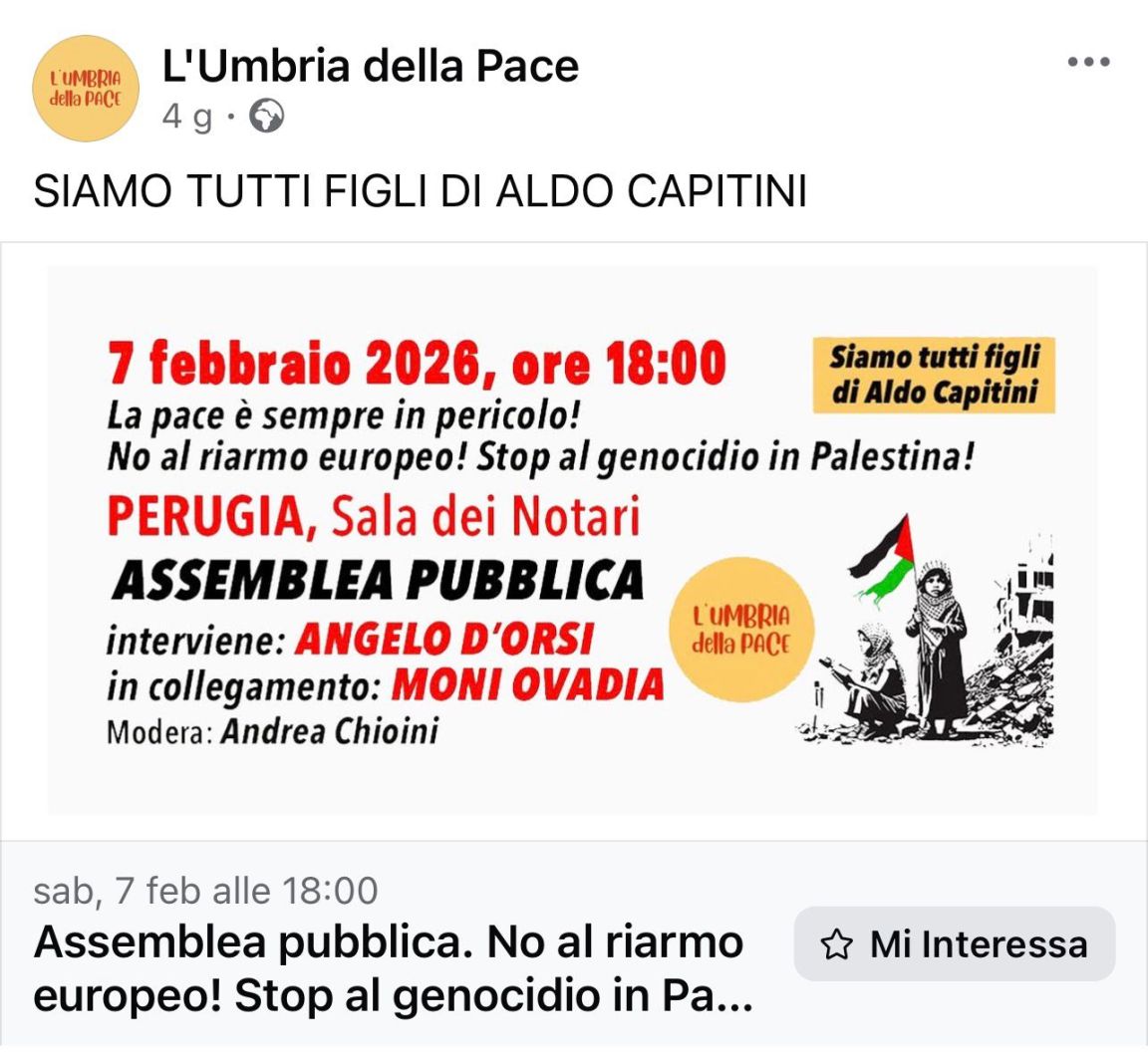 L’assemblea pubblica di sabato 7 febbraio è solo nel nome della Pace, che “è sempre in pericolo”, però con una richiesta di “No al riarmo europeo”, sostenuto invece da buona parte del Patto Avanti che governa Regione e Comune di Perugia, e infine un esplicito “Stop al genocidio in Palestina”.