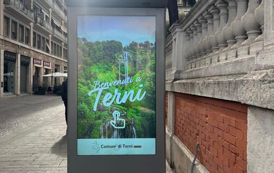 A large promotional totem displaying a welcome message for Terni, featuring a scenic image of a waterfall and lush greenery, set against a backdrop of urban buildings.