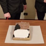 A decorative display featuring Santa Claus riding a reindeer, located in an outdoor setting with trees and signage in the background.