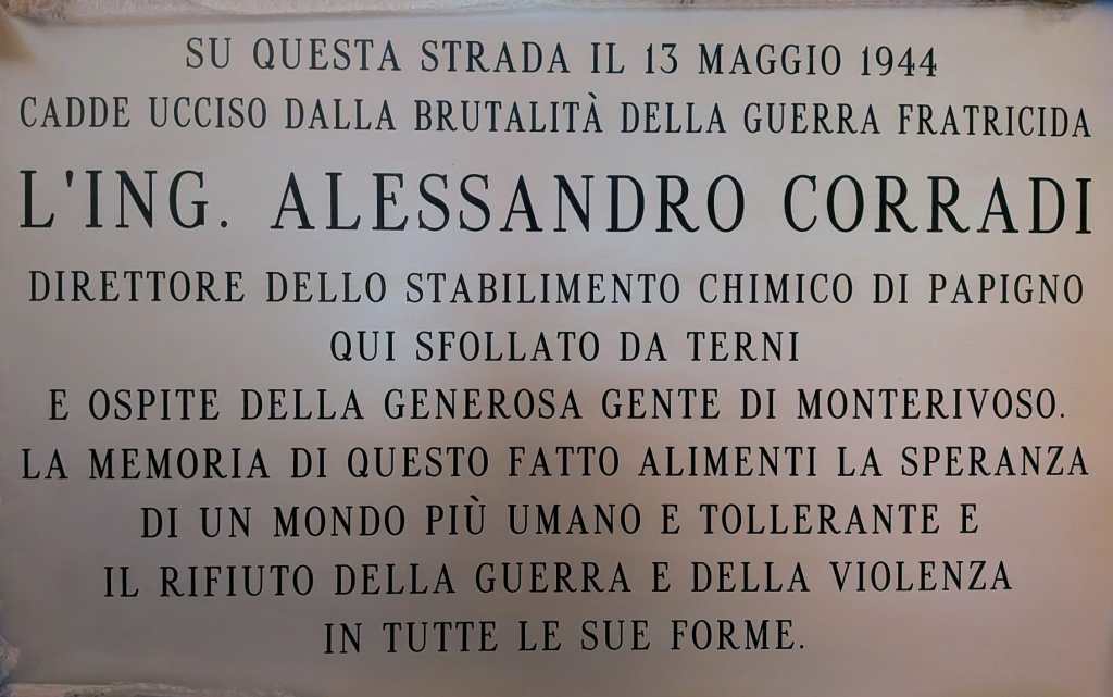 TERNI – Ferentillo rende omaggio ad Alessadro Corradi, il direttore dello stabilimento di Papigno ucciso con 23 pugnalate il 13 maggio del 1944. La mattina di venerdì 9 gennaio la sindaca Elisametta Cascelli ha scopero la targa in memoria dello stimato ingegnere ternano, che, per sfuggire alle incursioni aeree, si era trasferito a Monterivoso, in affitto nella casa dei Pacetti. Insieme alla sua famiglia, composta dalla moglie Emma, dai figli Luigi ed Anna, dalla sorella Teresa e dalla madre Ida. A ricordare quel terribile omicidio, il figlio Luigi Corradi: «La sera del 13 maggio, alle 21 in punto, entrarono in casa sei individui pesantemente armati. Chiesero di parlare con il capo famiglia. Una volta varcato l’ingresso chiusero l’accesso principale sulla strada. L’atteggiamento si fece immediatamente minaccioso. Era abbastanza chiaro che lo scopo dell’intrusione era di imprigionare o uccidere il capo famiglia confinato in un angolo dell’appartamento perfettamente consapevole del futuro che lo riguardava».