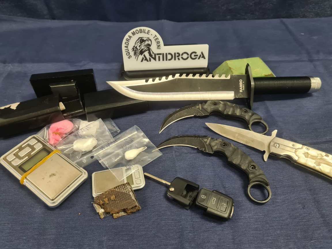 Gli operatori della Squadra Mobile, dopo aver assistito alla cessione della sostanza, hanno proceduto al controllo e alla successiva perquisizione personale e veicolare, che consentiva di rinvenire un ulteriore involucro contenente cocaina, per un peso complessivo di circa 10 grammi, nonché un bilancino di precisione e materiale per il confezionamento. Nel corso delle operazioni sul posto venivano inoltre rinvenuti due coltelli bifilari, per il cui possesso l’uomo è stato denunciato anche per questo reato.
