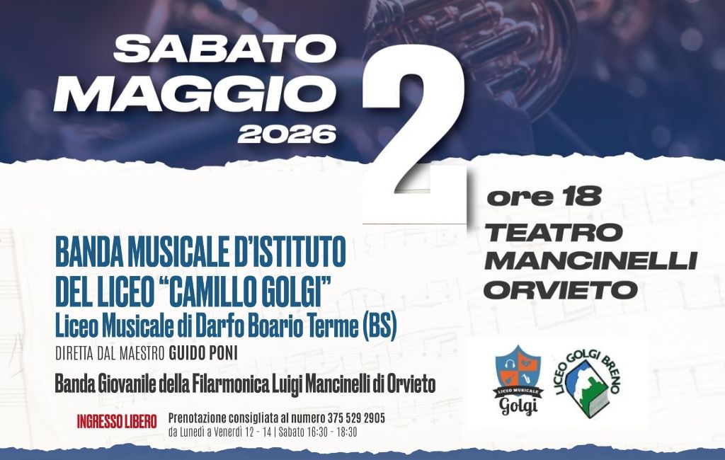 ORVIETO – Le celebrazioni per il 180esimo anniversario della fondazione della Filarmonica Luigi Mancinelli di Orvieto entrano nel vivo con un evento che mette al centro il talento dei più giovani. Sabato 2 maggio, alle ore 18, il prestigioso palcoscenico del Teatro Mancinelli accoglierà la Banda musicale d’istituto del Liceo Camillo Golgi di Darfo Boario Terme. La formazione bresciana, guidata dal maestro Guido Poni, sarà la protagonista di un pomeriggio all’insegna della grande musica d’insieme.