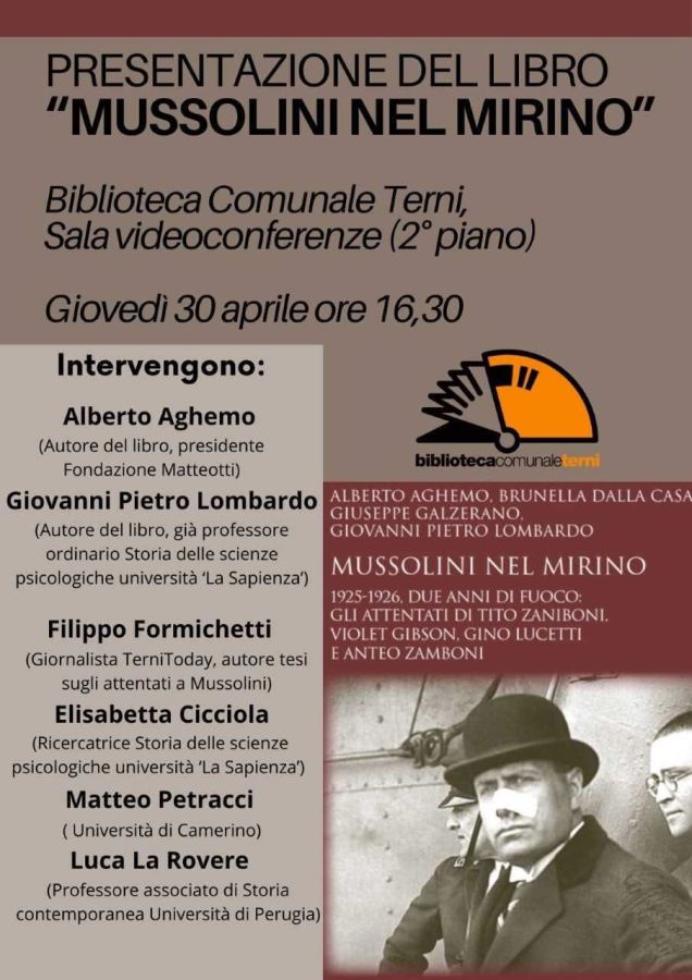 TERNI – Giovedì 30 aprile 2026, a partire dalle ore 16,30 in BCT, verrà presentato il libro dal titolo «Mussolini nel mirino», un’opera che analizza nel dettaglio il biennio 1925-1926, periodo caratterizzato dai tentativi di colpire il capo del fascismo. L’incontro vedrà la partecipazione di un nutrito gruppo di esperti e studiosi che offriranno diverse prospettive sui fatti documentati nel volume. Tra i relatori saranno presenti gli autori Alberto Aghemo, presidente della Fondazione Matteotti, e Giovanni Pietro Lombardo, già professore ordinario di Storia delle scienze psicologiche presso l’università «La Sapienza». Il dibattito sarà arricchito dai contributi di Filippo Formichetti, giornalista di TerniToday e autore di una tesi specifica sugli attentati a Mussolini, e di Elisabetta Cicciola, ricercatrice in Storia delle scienze psicologiche sempre presso l’ateneo romano. Interverranno inoltre Matteo Petracci dell’Università di Camerino e Luca La Rovere, professore associato di Storia contemporanea all’Università di Perugia. Al centro della discussione ci saranno le figure di coloro che cercarono di cambiare il corso della storia italiana attraverso l’azione diretta: Tito Zaniboni, Violet Gibson, Gino Lucetti e Anteo Zamboni.