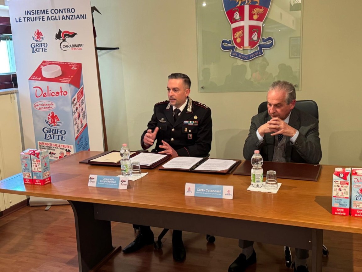 In occasione della sottoscrizione, il comandante provinciale Molinari ha sottolineato “l’importanza della collaborazione con una realtà produttiva radicata nel territorio e la particolare tipologia di prodotto utilizzato, che costituiscono veicoli efficaci e diffusi per raggiungere un’ampia platea e rafforzare l’azione di prevenzione a tutela delle fasce più vulnerabili”. “Grazie a questa sinergia – ha proseguito il comandate Molinari –, insieme alle altre metodologie condotte dall’Istituzione nel fronteggiare al meglio il delicato fenomeno potremo, pertanto, alimentare e divulgare una sempre maggiore conoscenza e consapevolezza nella popolazione circa le possibili insidie che si annidano di fronte a illeciti comportamenti di malintenzionati, che possono manifestarsi sia in presenza che attraverso le molteplici forme di comunicazione e/o tecnologia di cui oggigiorno si dispone”. Il presidente del Gruppo Grifo Agroalimentare Catanossi ha evidenziato come “l’invito dell’Arma dei Carabinieri per questa collaborazione è per noi motivo di orgoglio. Un’iniziativa che serve non solo a informare le persone anziane sul pericolo delle truffe telefoniche e on line ma anche chi le accudisce e assiste quotidianamente. Le persone fragili che ogni anno sono oggetto di truffe sono numerose e le forme fraudolente sono sempre più raffinate e difficili da individuare”. “Con l’inserimento di informazioni utili sulle nostre confezioni di latte, che entrano praticamente in tutte le case degli umbri e non solo – ha concluso Catanossi –, intendiamo coadiuvare i Carabinieri nella loro lotta alle truffe agli anziani e alle persone fragili attraverso un’azione di informazione mirata e duratura”.
