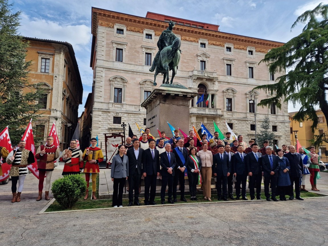 Il tema generale dell’incontro, “Dialogo tra le civiltà attraverso la ceramica e la porcellana · Cooperazione e sviluppo condiviso tra le città”, è stato approfondito attraverso due principali direttrici: da un lato, la trasmissione e l’innovazione della cultura ceramica e della porcellana, con particolare attenzione all’integrazione tra tecniche tradizionali, design contemporaneo e nuove tecnologie in un’ottica di sostenibilità; dall’altro, il rafforzamento degli scambi e della cooperazione internazionale tra città italiane e cinesi, quale leva strategica per lo sviluppo dell’economia culturale, del turismo e delle filiere produttive correlate. Per dare concretezza a questa forte volontà di collaborazione si è proceduto alla firma di quattro memorandum di cooperazione e di amicizia. Il primo tra la Provincia di Perugia e la città Metropolitana Jingdezhen, il secondo tra il Comune di Gualdo Tadino e la città di Quyang, il terzo tra l’Associazione “La Strada della Ceramica” in Umbria e l’Associazione Dingyao, il quarto tra il Centro Comunicazione Internazionale Shaanxi e Azzurra TV Italia. Ad accogliere gli ospiti cinesi, in apertura di giornata sono stati gli Sbandieratori di Gubbio che si sono esibiti in Piazza Italia di fronte alle autorità. Presente all’evento anche il sindaco della città dei ceri, Vittorio Fiorucci.