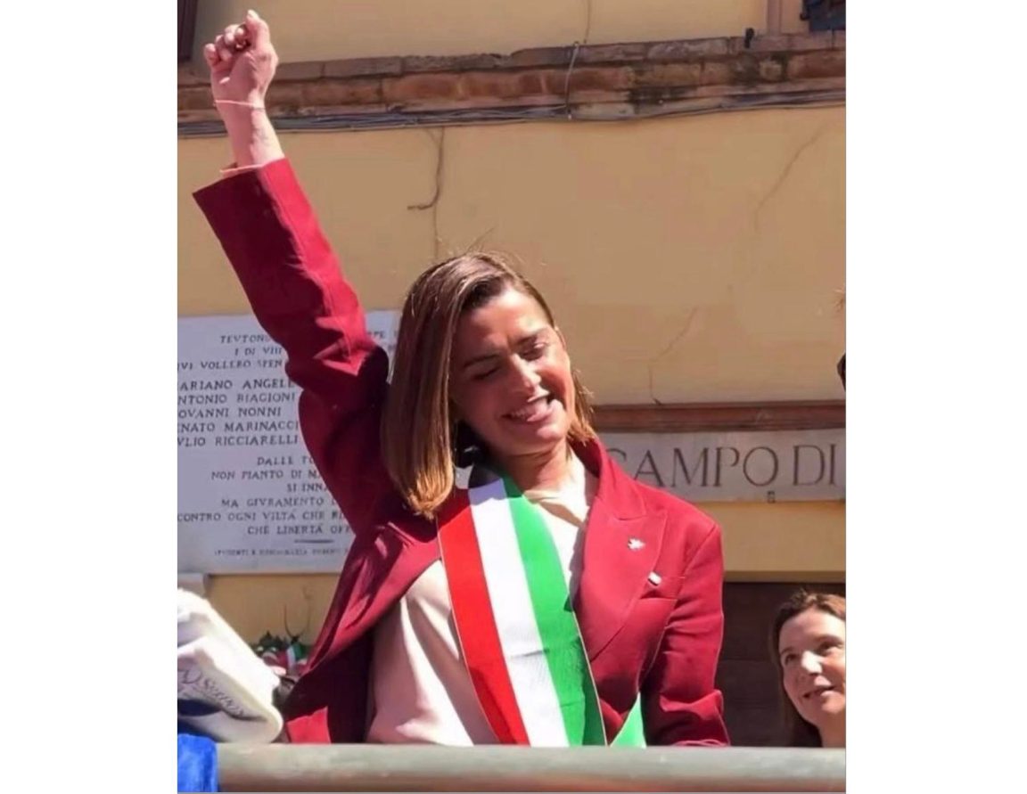 PERUGIA – Se non è un trucco dovuto alla perfidia dell’Intelligenza Artificiale – e semmai ci scusiamo subito -, in questa foto abbiamo una sindaca (la sempre molto empatica Vittoria Ferdinandi, prima cittadina di Perugia), con una giacchetta rossa che le dona e con la fascia tricolore, simbolo del suo ruolo di rappresentante di tutti i cittadini di Perugia, che saluta col pugno chiuso da un palco delle celebrazioni del 25 aprile.