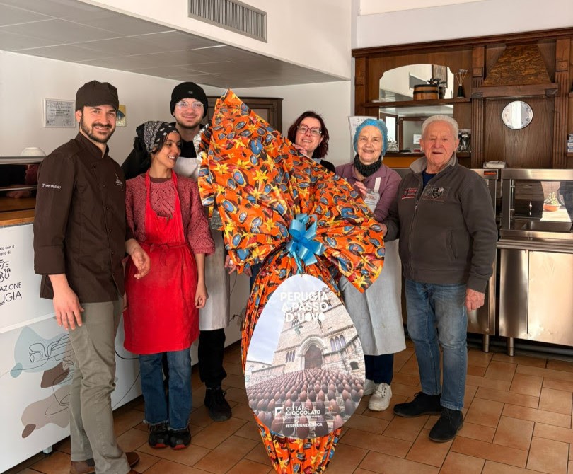 PERUGIA – “Perugia a Passo d’Uovo”, il programma di iniziative promosso dal museo Città del Cioccolato in occasione delle festività pasquali, dà spazio anche alla solidarietà. E’ stato infatti consegnato alla Mensa “don Gualtiero” della Caritas di Perugia il maxi uovo di cioccolato da 10 chili che andrà ad addolcire i pasti caldi distribuiti quotidianamente dagli oltre 70 volontari a chi vive ai margini della comunità. Attiva dal 2022, la Mensa “don Gualtiero” serve ogni giorno 90 pasti in loco e 50 box da asporto per cena, offrendo, insieme ai cibo, anche una possibilità di ristoro e di sana socialità.