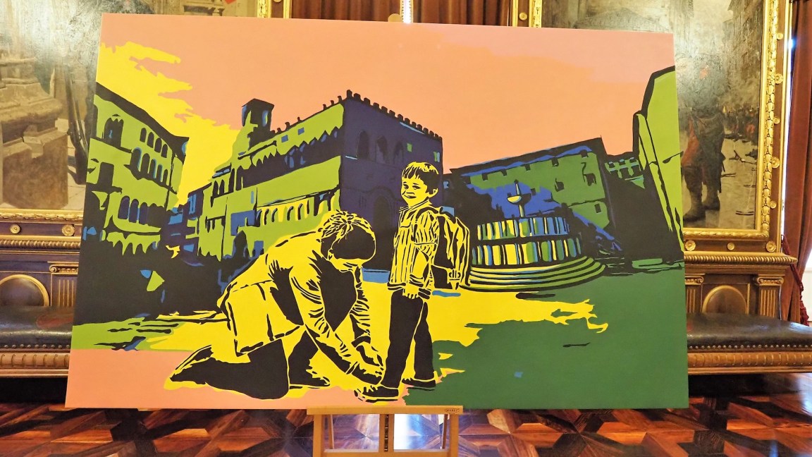 Un cielo rosa e piazza IV Novembre: così la Fondazione Cassa di risparmio di Perugia rappresenta il sostegno alla propria comunità