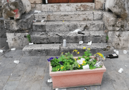 Bottiglie di superalcolici e altri resti di bivacchi persino di fronte all’ingresso della chiesa, tra i due leoni di epoca romana