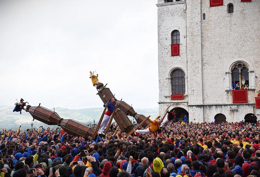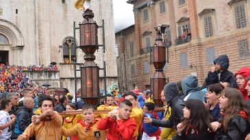 in -> primo piano, Attualità Via Ch’Eccoli! Oggi è il giorno dei Ceri di Gubbio Tutto pronto in piazza Grande per la festa del simbolo della Regione Umbria