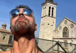 Tra un ciak e l’altro di “Don Matteo” Raoul Bova a Spoleto si gode il sole davanti al duomo