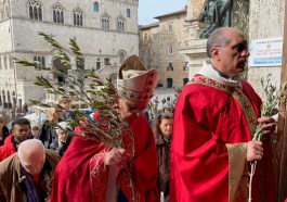 in -> primo piano, Attualità L’arcivescovo Maffeis ai perugini: «Siate pronti alla Pasqua» È tornata la suggestiva la processione per la Domenica delle Palme in piazza IV Novembre