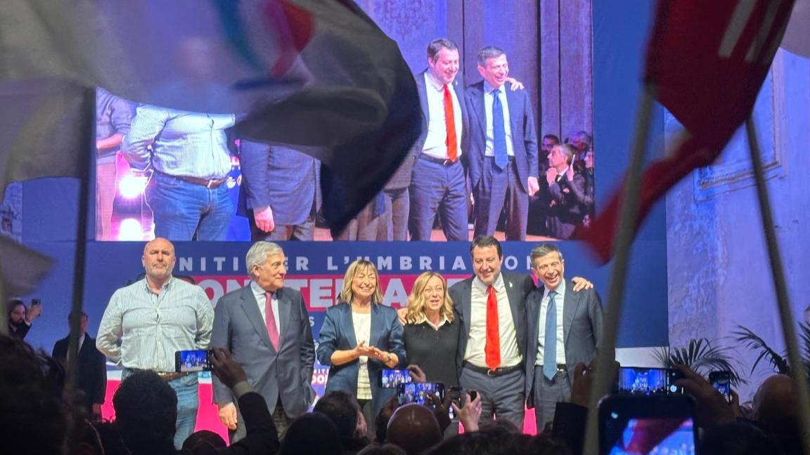 Meloni infiamma la platea: «Continueremo a fare ciò che la gente ci chiede, avanti con Donatella Tesei per i prossimi 5 anni»