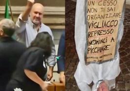 Il manichino a testa in giù alimenta lo scontro tra il sindaco e le opposizioni di sinistra e di destra. IL VIDEO di Bandecchi