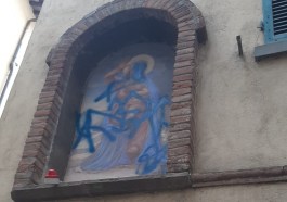 in -> primo piano, Cronaca Vernice spray sull’affresco della Madonna, il Comune presenta denuncia contro ignoti Ancora forte l’indignazione in città per l’atto vandalico subito dall’opera di Settimio Rometti